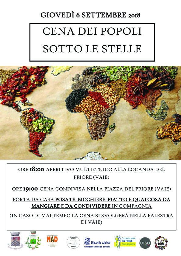 Cena dei popoli sotto le stelle, giovedì 6 settembre i piazza del Priore a Vaie. All'iniziativa aderisce anche il Comune di Sant'Antonino.