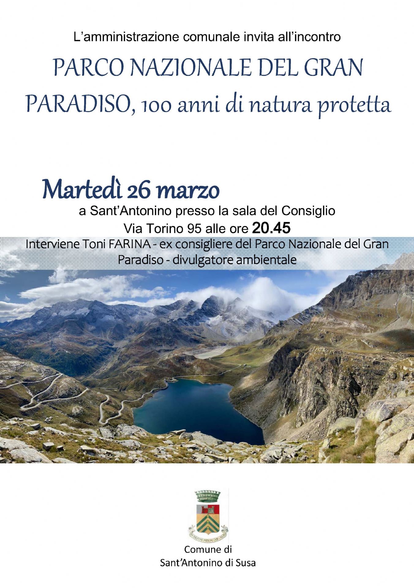 L'amministrazione comunale vi invita martedi 26 marzo 2024 alle ore 20,45 presso la sala Consiliare, all'Incontro sul PARCO NAZIONALE DEL GRAN PARADISO - 100 anni di natura protetta. Interviene l'esperto TONI FARINA.