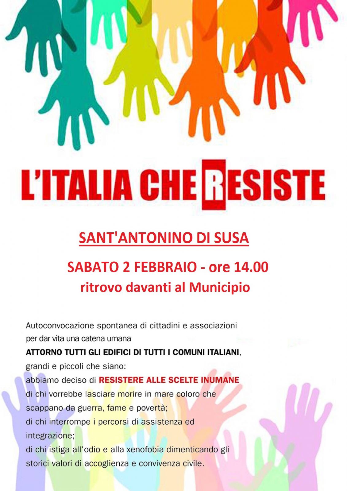 Anche Sant'Antonino aderisce a “L'Italia che resiste”, autoconvocazione spontanea di cittadini e associazioni, sabato 2 febbraio alle ore 14, per dar vita ad una catena umana attorno alle sedi di tutti i Comuni Italiani. Il ritrovo sarà davanti al Municipio, in via Torino 95.
