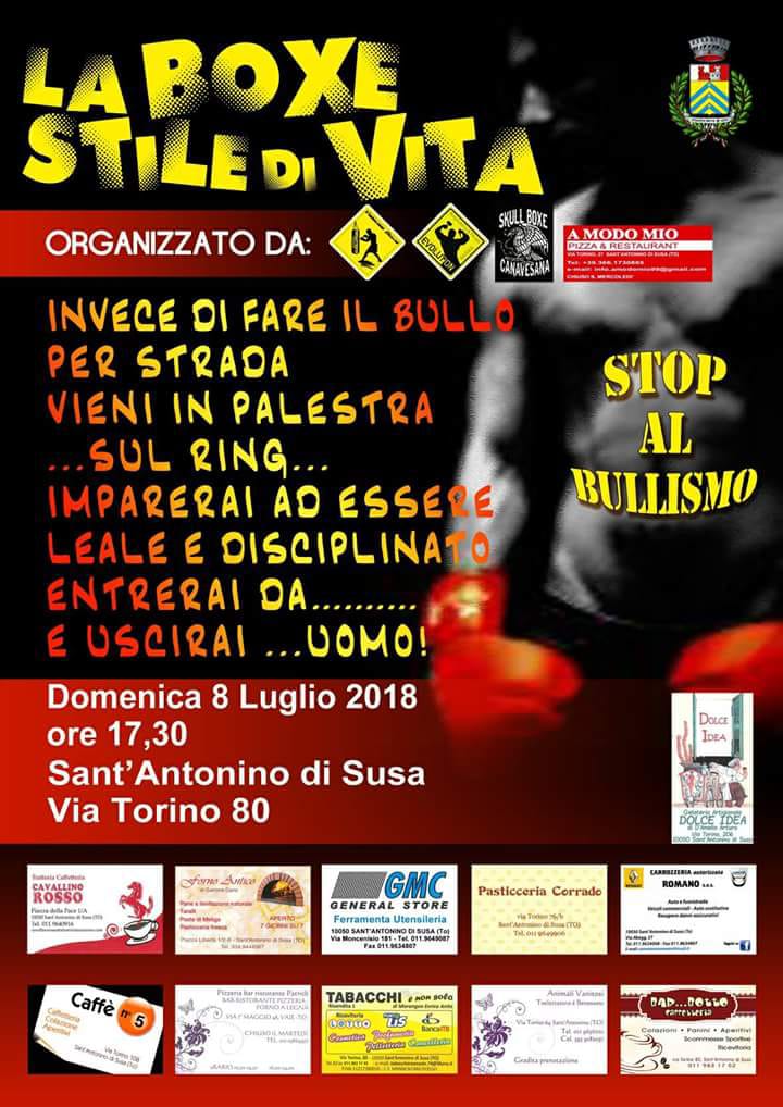 Invece di fare il bullo per strada, vieni in palestra. È l'invito delle associazioni sportive Evolution e dello Skull Boxe Canavesana che organizzano, domenica 8 luglio alle 17, 30 in via Torino 80, all'angolo fra le via Abegg e Caduti di Nassirya, col patrocinio del Comune, un incontro su “La boxe, stile di vita” che è anche un'occasione per dire basta al bullismo.