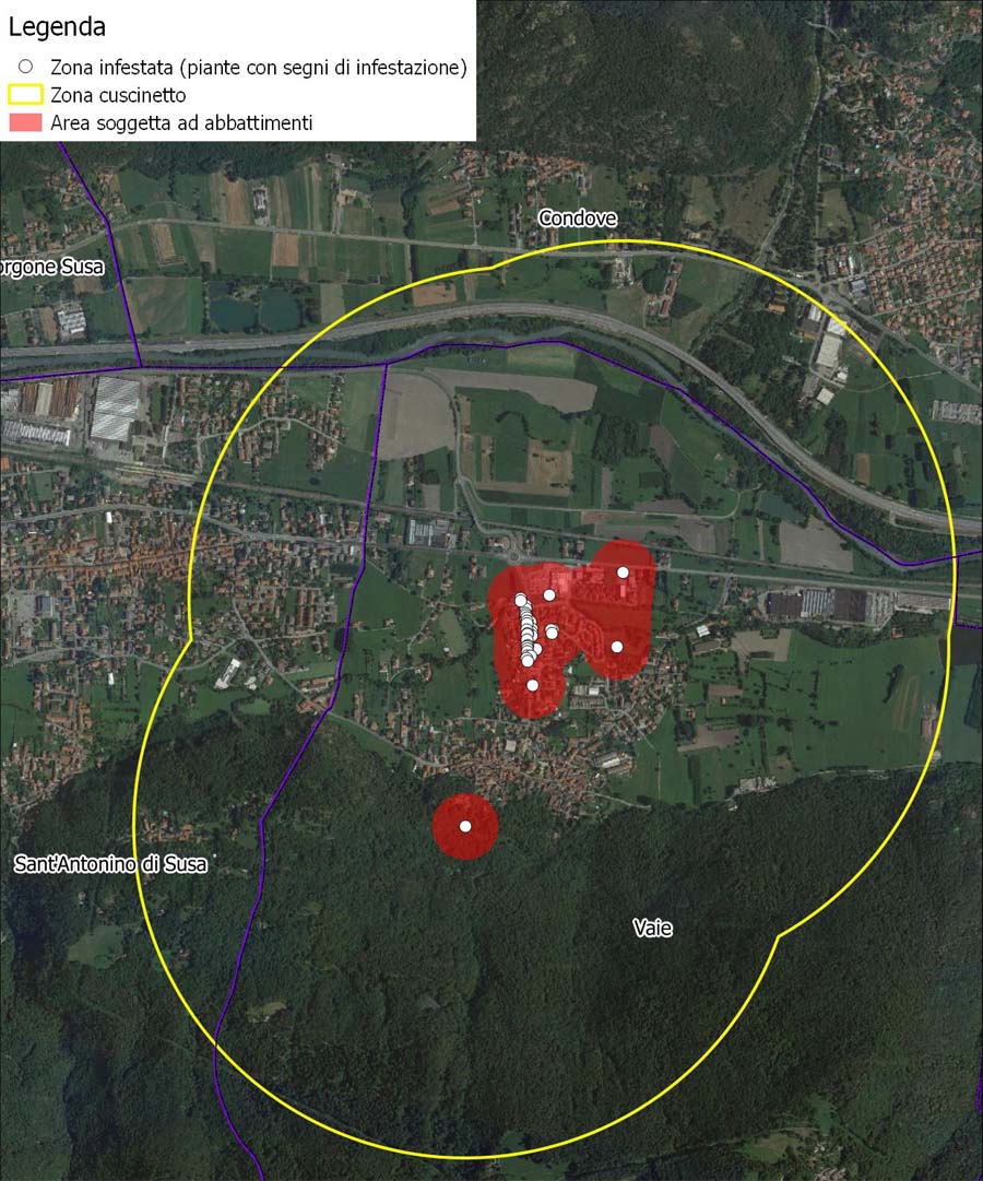 Dal 30 ottobre a fine marzo 2020 i tecnici forestali nominati dal settore Fitosanitario e Servizi Tecnico Scientifici dell'assessorato regionale all'agricoltura, riprenderanno i monitoraggi relativi all'individuazione del Tarlo Asiatico del fusto, il cui focolaio è stata scoperto a Vaie a luglio dello scorso anno. L'operazione, già concretizzata in una prima fase da febbraio a fine marzo di quest'anno e che verrà ripetuta per quattro anni, riguarda la zona cuscinetto, individuata nella mappa allegata, e interessa anche il territorio di Sant'Antonino.