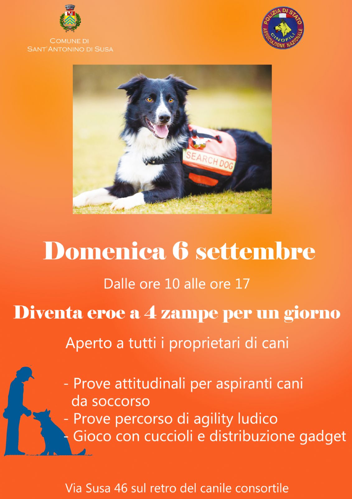 Domenica 6 settembre dalle ore 10,00 alle ore 17,00, presso l'area gestita dall'Associazione Nazionale Cinofili della Polizia di Stato (via Susa 46, sul retro del canile), anche il vostro cane potrà diventare eroe a 4 zampe per un giorno.