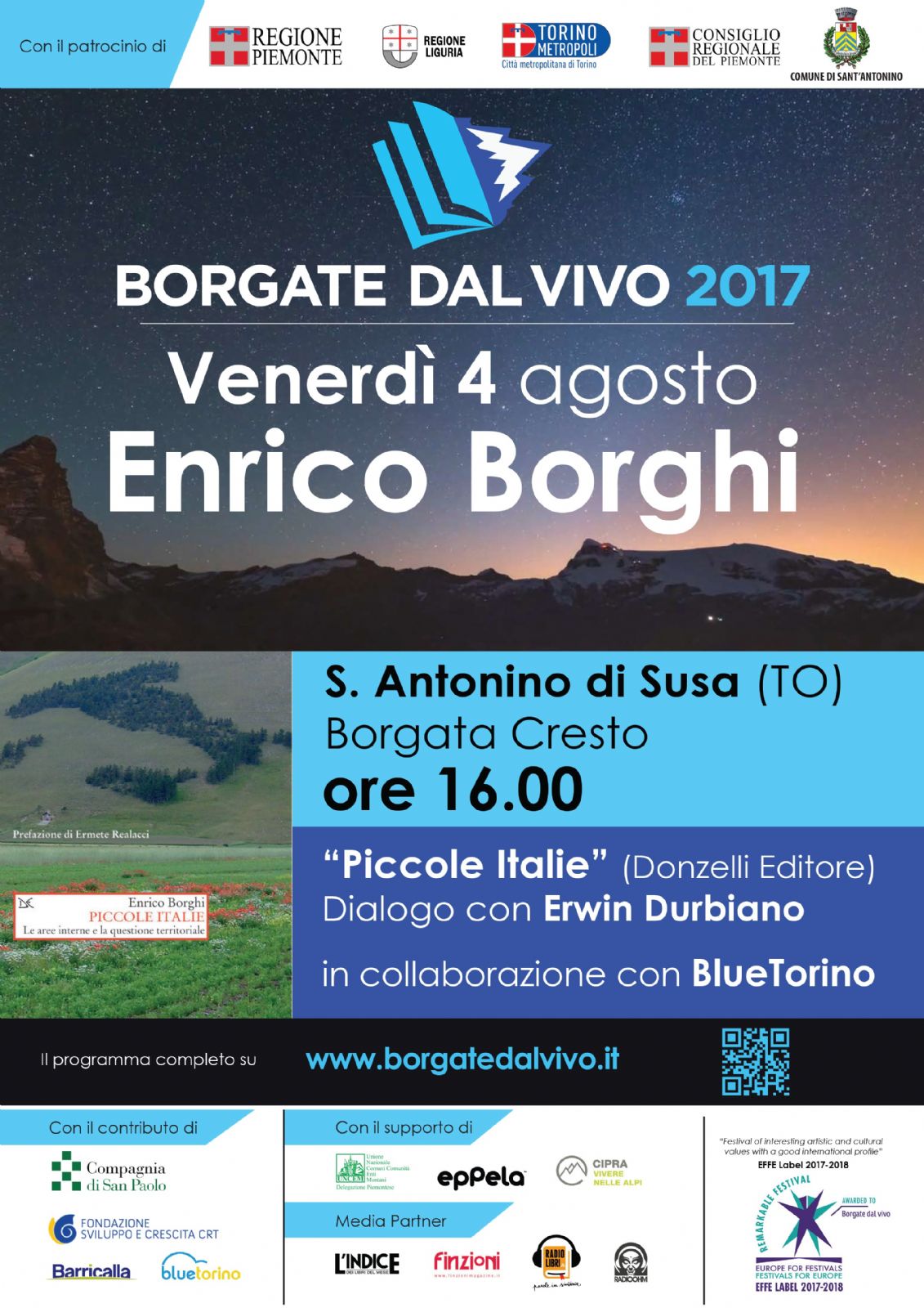 Enrico Borghi, deputato del Partito Democratico, presenta il suo libro “Piccole Italie”, venerdì 4 agosto alle 16 in borgata Cresto. Il volume, edito da Donzelli, è una riflessione su cosa sia la politica territoriale, dopo la fine dell'interventismo statale e la crisi del regionalismo, e su cosa possano rappresentare i territori nella sfida della modernizzazione italiana. L'incontro è organizzato da Borgate dal Vivo e dal Comune in collaborazione con Blue Torino.