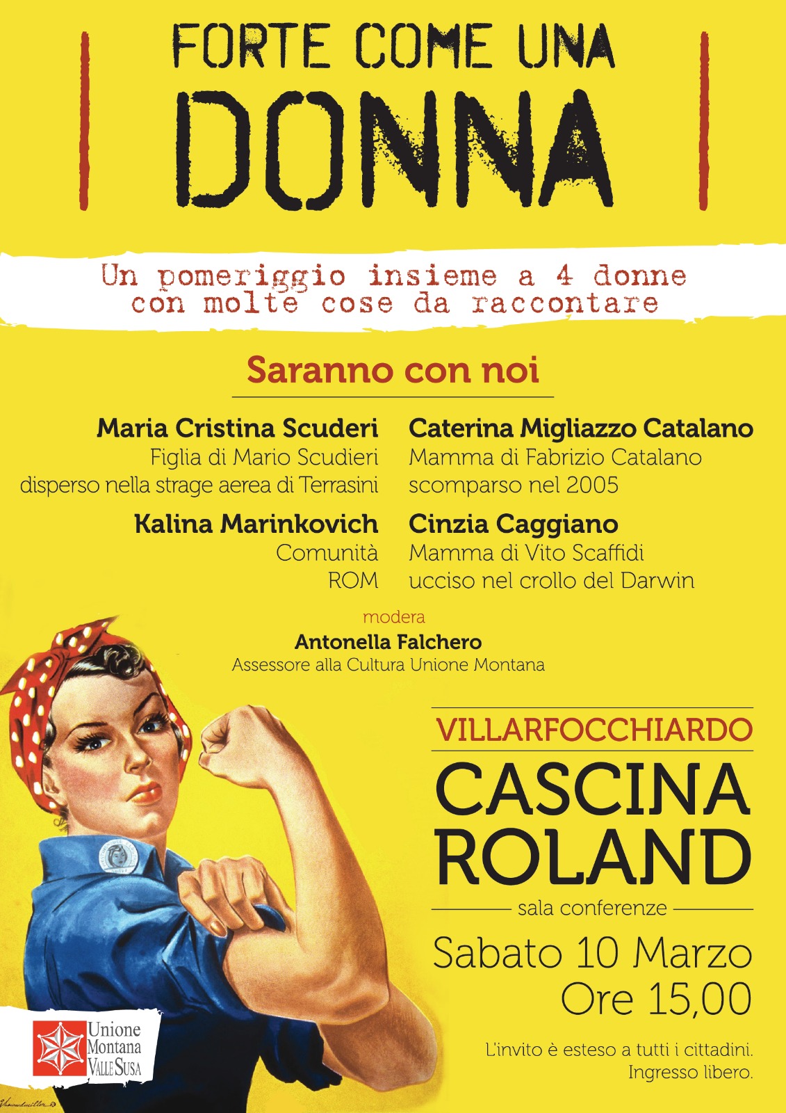 Nell'ambito della celebrazione della giornata della donna, l'Unione montana valle Susa organizza, sabato 10 marzo alle ore 15 presso Cascina Roland, a Villarfocchiardo, "Forte come una donna", un pomeriggio insieme a quattro donne che racconteranno un momento drammatico della loro vita: Maria Cristina Schuderi, Caterina Migliazzo Catalano, Kalina Marinkovich e Cinzia Caggiano. Coordina l'incontro Antonella Falchero, assessore alla cultura dell'Unione montana.