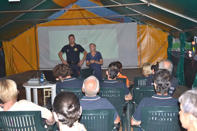 Il senso della serata è ben sintetizzato da tre video, che mostrano riprese delle alluvioni a Genova, Ancona e della bomba d'acqua che qualche settimana fa ha interessato la zona della stazione di Rosta. Si vede chiaramente come alcuni cittadini non abbiano compreso il pericolo che stavano correndo, rischiando o finendo di essere travolti dall'acqua. A mostrarli, Stefano Lergo, coordinatore del gruppo Anti incendi boschivi di Sant'Antonino, che lunedì 9 luglio, sotto la tensostruttura di piazza della Pace, ha avvertito dei pericoli insiti nell'assenza di una cultura dell'emergenza che faccia almeno intuire la portata dei rischi.