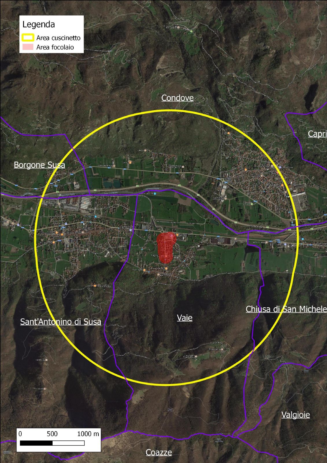 Dopo l'individuazione, a Vaie, della presenza, per la prima volta in Piemonte del tarlo asiatico del fusto, la Regione ha stabilito delle misure obbligatorie per impedirne l'introduzione e la diffusione. Fra queste è previsto il divieto di spostamento del legname e dei residui di potatura risultatnti dai tagli effettuati nella "zona cuscinetto" con un raggio di 2 Km attorno alla zona infestata (immagine allegata) che ricade in parte dei Comuni di Vaie, Condove, Chiusa San Michele, Borgone Susa, Sant’Antonino.