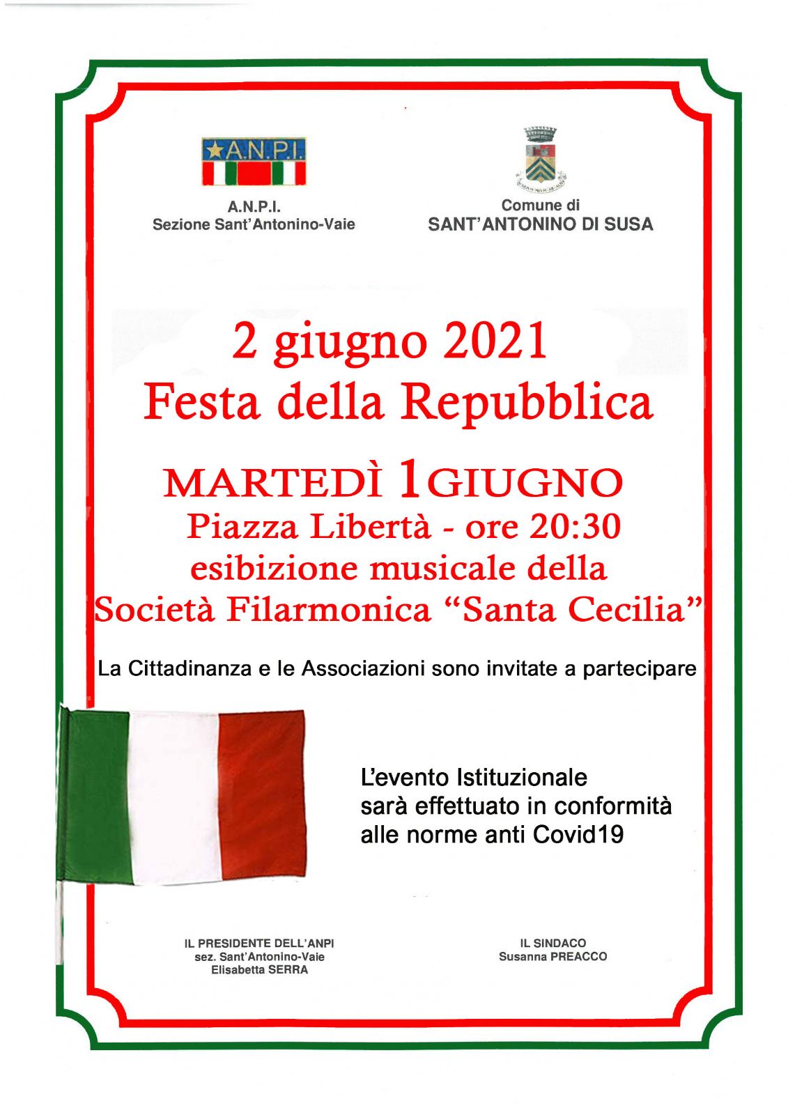 Martedì 1 giugno alle ore 20,30 in piazza Libertà esibizione della Banda musicale "Santa Cecilia" di Sant'Antonino di Susa.