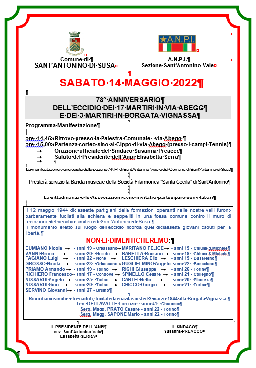 - ore 15,00 - partenza del corteo diretto ai campi da tennis, dove sarà effettuata l’orazione ufficiale del sindaco Susanna Preacco e del presidente dell’ANPI Sant’Antonino-Vaie Elisabetta Serra.