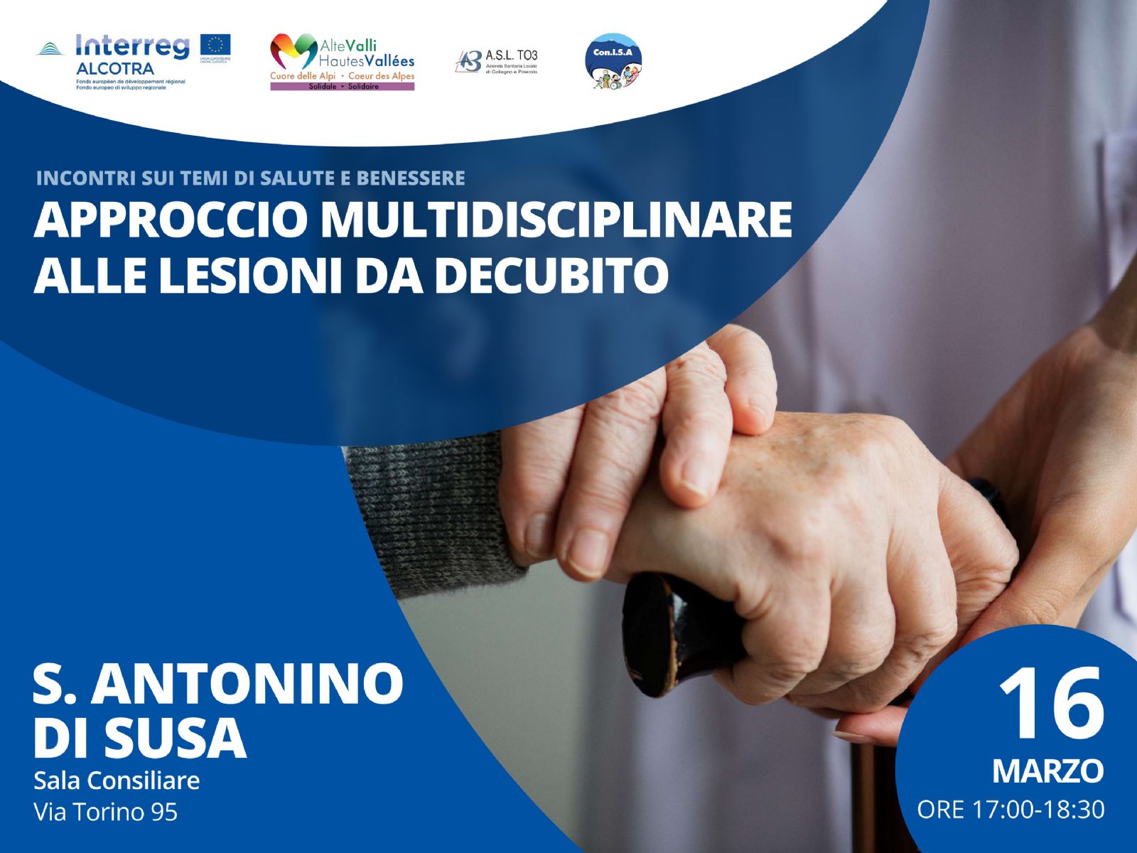 Nell'ambito della rassegna di incontri tematici "Progetto Cuore Solidale" mercoledì 16 marzo dalle ore 17,00 alle ore 18,30 si invita a partecipare all'incontro "Approccio multidisciplinare alle lesioni da decubito", presso la Sala consiliare in via Torino n. 95.