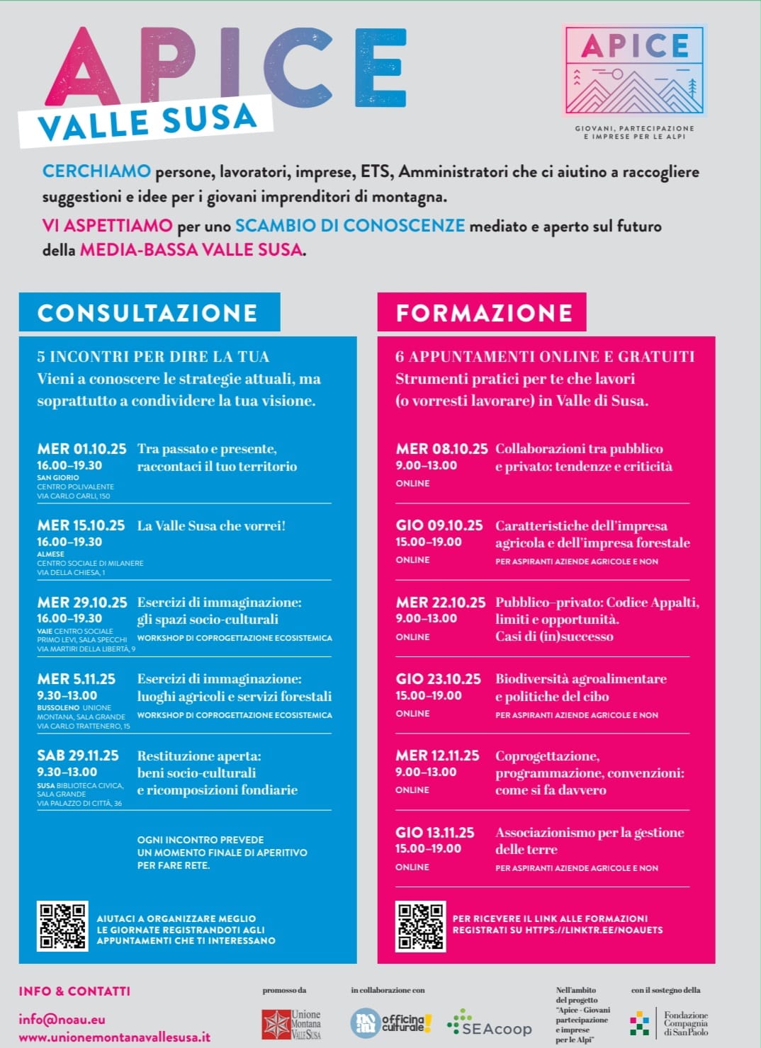 Per scoprire tutto il percorso e registrarsi agli appuntamenti, basta consultare il sito dell'Unione Montana Valle Susa - sezione “Progetto Apice" (www.unionemontanavallesusa.it), o i canali social dell'ente (Facebook, Instagram, LinkedIn) oppure cliccare sul seguente link