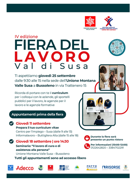 L'Unione Montana Valle Susa e con l'Agenzia Piemonte Lavoro, tramite il Centro per l’impiego di Susa, organizza la IV edizione della Fiera del Lavoro: un’importante opportunità per le persone che cercano un’occupazione o desiderano cambiare il proprio percorso professionale e le imprese del territorio che stanno facendo recruiting.