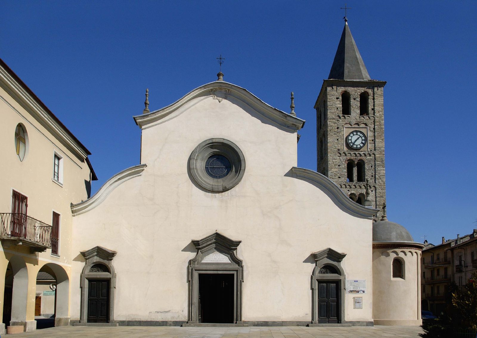 È una delle chiese romaniche più antiche della Valle di Susa, benché solo il campanile restaurato nell’estate del 2001 conserva ancora quasi intatto lo stile originario; l’edificio è orientato verso est-ovest, ha tre absidi curve e fianchi ornati da lesene e archetti pensili. Dell’antica costruzione sono conservate importanti tracce negli archetti dell’abside meridionale formati da una cornice di mattoni a «denti di sega» correnti tra due listelli e da una serie di mattoni sottili disposti ad angolo, in modo da formare una elegante linea a zig-zag. L’edificio fu decurtato di 14 metri nel 1698 poiché versava in cattive condizioni lasciando spazio all’attuale sagrato, nella stessa epoca venne rifatta buona parte della copertura della navata centrale. Nei due secoli successivi fu rifatto il pavimento e trasferito il cimitero, un tempo collocato nel «cortile della absidi», furono costruite - addossate alla struttura - le cappelle laterali e il battistero. La facciata a capanna spezzata fu costruita tra il 1930 e il 1931. Recentemente è stato rinvenuto un altare medievale e restaurati alcuni affreschi di notevole pregio ed interesse. All’esterno una Crocifissione, una Tentazione di sant’Antonio e un san Michele Arcangelo attribuiti al maestro di S. Bernardino di Lusernetta (XV secolo). Nell’abside maggiore, frammenti di figure di santi realizzati all’inizio del Cinquecento, mentre nell’abside destra una bella «Pala» dedicata al tema dell’Annunciazione, Crocifissione con la Vergine e san Giovanni, figure di santi (tra questi santa Brigida d’Irlanda) databili tra XIV e XV secolo e un richiamo a sant’Agata nel velario del XII secolo. Il campanile ha pianta quadrata, è alto 29 metri, ha sette piani e quattro lesene laterali. Fu costruito nella seconda metà dell’XI secolo, ma già nel 1739 fu sostituita l’antica cuspide e i solai interni. Nel 1763 fu collocato l’orologio meccanico.